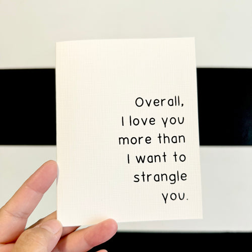 "Overall, I love you more than I want to strangle you." Quoted. Greeting Card